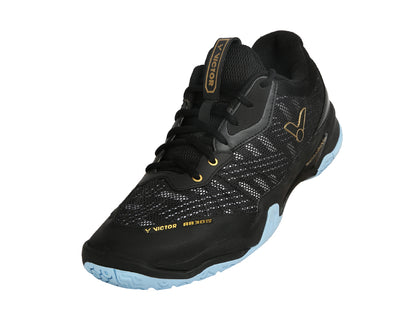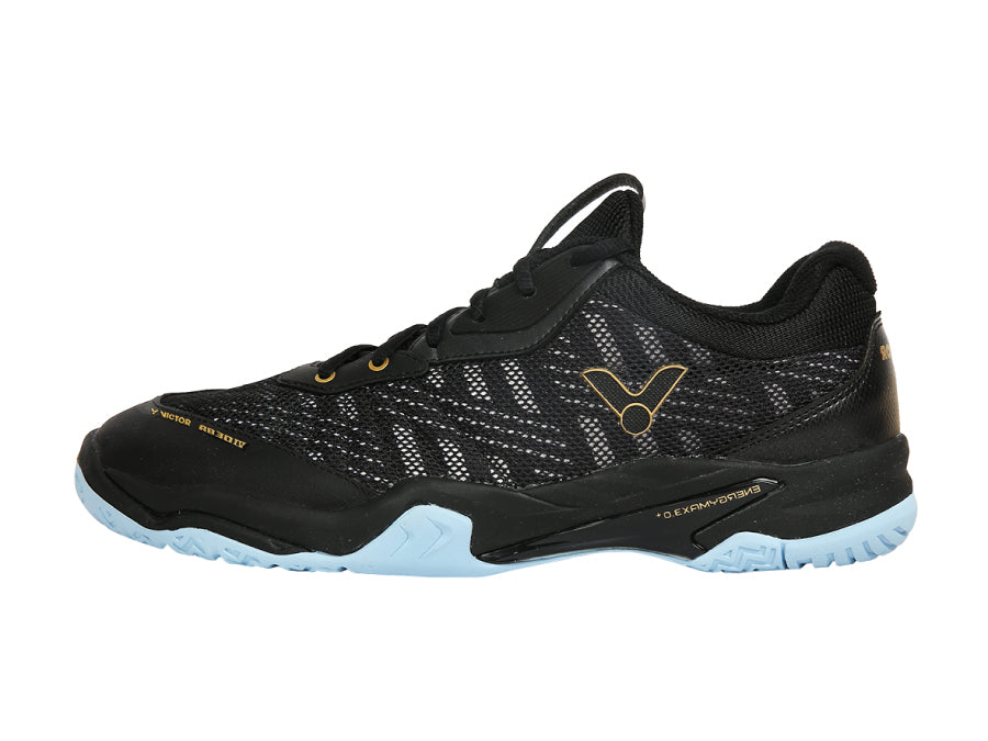 Victor A830IV C Black U-shape 3.5 is black with blue accents. Thanks to technical innovations, the shoes are much more stable with much better grip, and the low weight of the shoes provides maximum support for speed on the court.